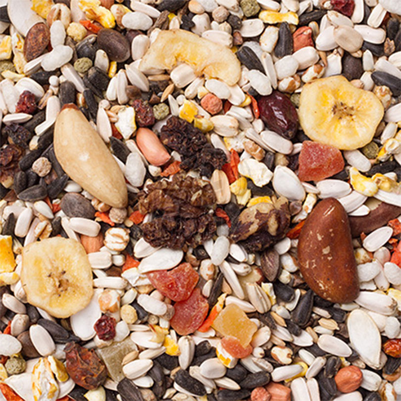Valmistusaineet: Musta auringonkukansiemen, iso raidallinen auringonkukansiemen, valkoinen auringonkukansiemen, saflori, valkoinen durra, tattari, turvotettu maissi, kurpitsansiemen, setripähkinä, parapähkinä, vehnä, paisutettu vehnä, pelletit, kuoritut maapähkinät, gritti, ruusunmarjat, paddy riisi, kuorittua kauraa, porkkanan paloja, saksanpähkinät, maito-ohdake, pihlajan marjat, banaaniviipaleet, ananas, papaija, chili.